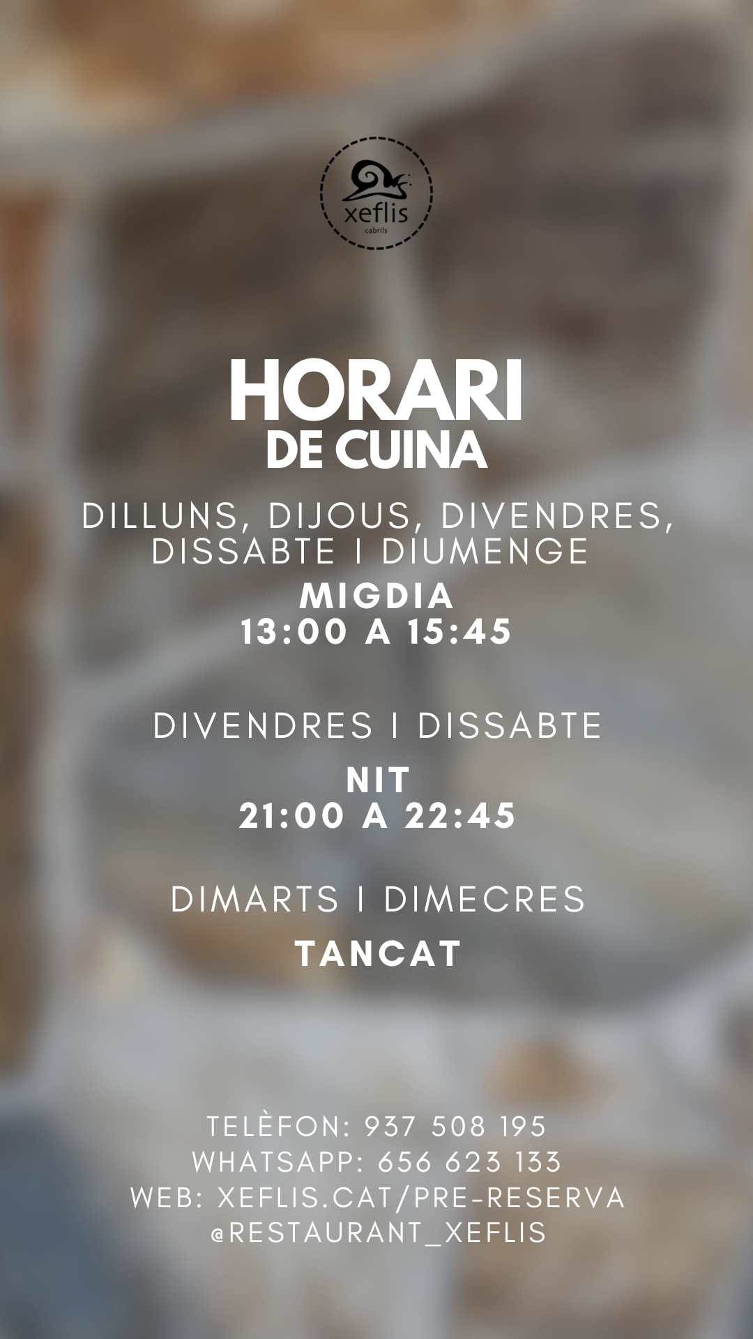 *Les pre-reserves realitzades entre dilluns a la tarda, fins dimecres, es confirmaran dijous al matí! Dimarts i dimecres tenim tancat per descans de tot el personal!